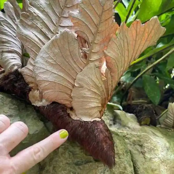 The brown, papery "nest" fronds are a natural part of the plant and should not be removed. They help to collect debris and moisture, providing nutrients for the fern.
