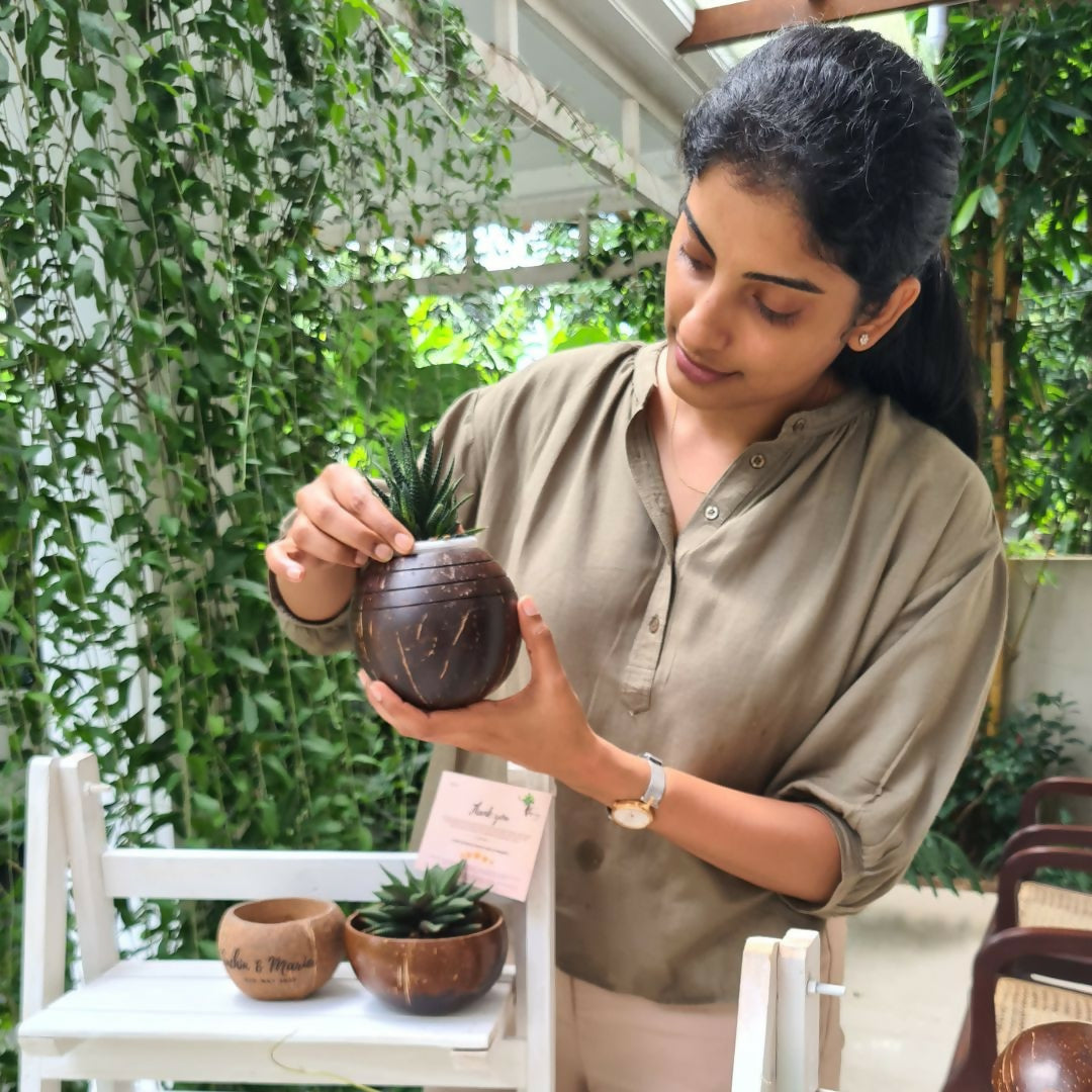Thenga Coconut Shell Three line Indoor/Gardening Planter Pot is an eco-friendly planter handcrafted from natural coconut shells, showcasing a unique Three line design that adds a touch of rustic elegance to any space. Ideal for succulents, small cacti, herbs, and other small plants, this planter pot is perfect for both home decor and practical gardening. Sustainably sourced and meticulously crafted by skilled artisans in Kerala, each pot is unique in its natural grain and texture, making it a beautiful and functional addition to your garden or home.