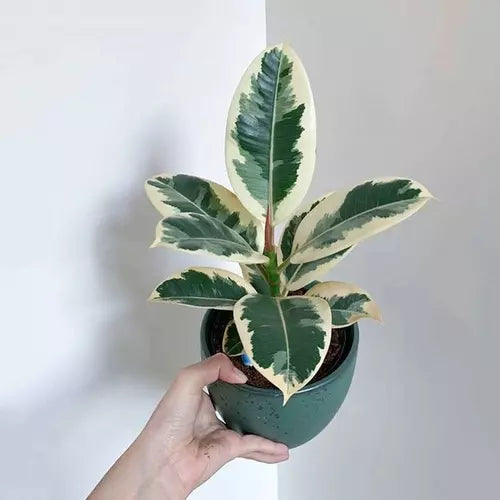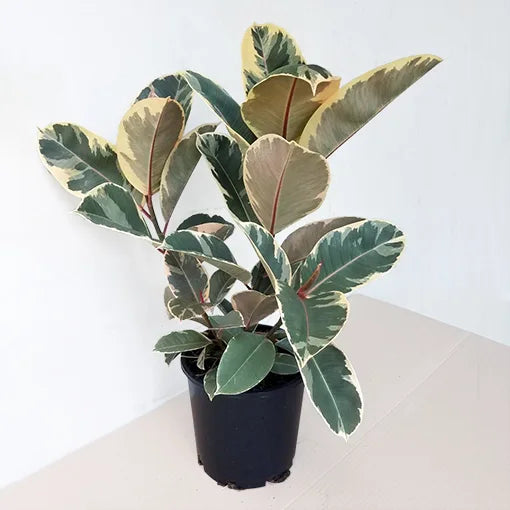 The Ficus elastica Tineke, commonly known as the Rubber Plant White Variegated or just "Tineke," is a popular houseplant known for its striking leaves with shades of green, white, and often pink or ruby red.