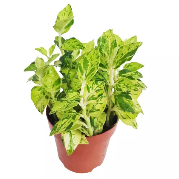 Splish Splash Devil's Backbone (Pedilanthus tithymaloides) is an upright, bushy, clump forming, succulent shrub with thin, fleshy to woody, zigzagged stems. Evergreen or deciduous, ovate to elliptic, mid green with marbled lighter green leaves.