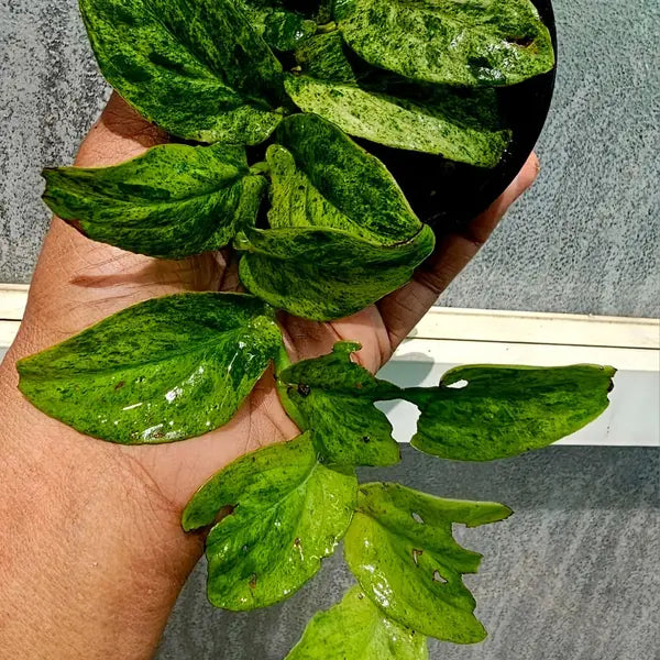 Here’s a complete Raphidorphia korthalsii aurea verigated 🌿 care guide — a rare tropical climber admired for its stunning golden-yellow variegation on heart-shaped leaves.