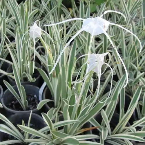 Variegated Spider Lily is a very attractive plant even when it is not in bloom. Creamy white and green variegated foliage is adorned with white spider-like flowers mid-summer. This variety of Hymenocallis will tolerate more shade than other varieties.