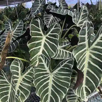Alocasia longiloba features large, glossy, deep green leaves with contrasting white veining. The heart shaped foliage makes this plant a statement piece for your home.