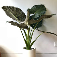 Alocasia Regal Shields has a large velvet textured leaf with a deep green color and contrasting veining. Care tips below.