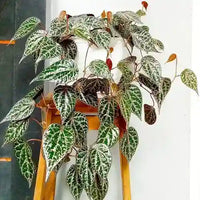 The Piper Crocatum, also called Red Betel Leaf, offers stunning heart-shaped leaves. The pink veins and pattern paired with the silvery-green make it a very unusual climbing houseplant.