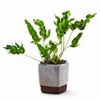 The Twister Fern grows upright and is supported by rhizomal growth. It is quite fast growing and produces a full pot of beautiful wavering fronds. Potted in our Baley eggshell, square pot.